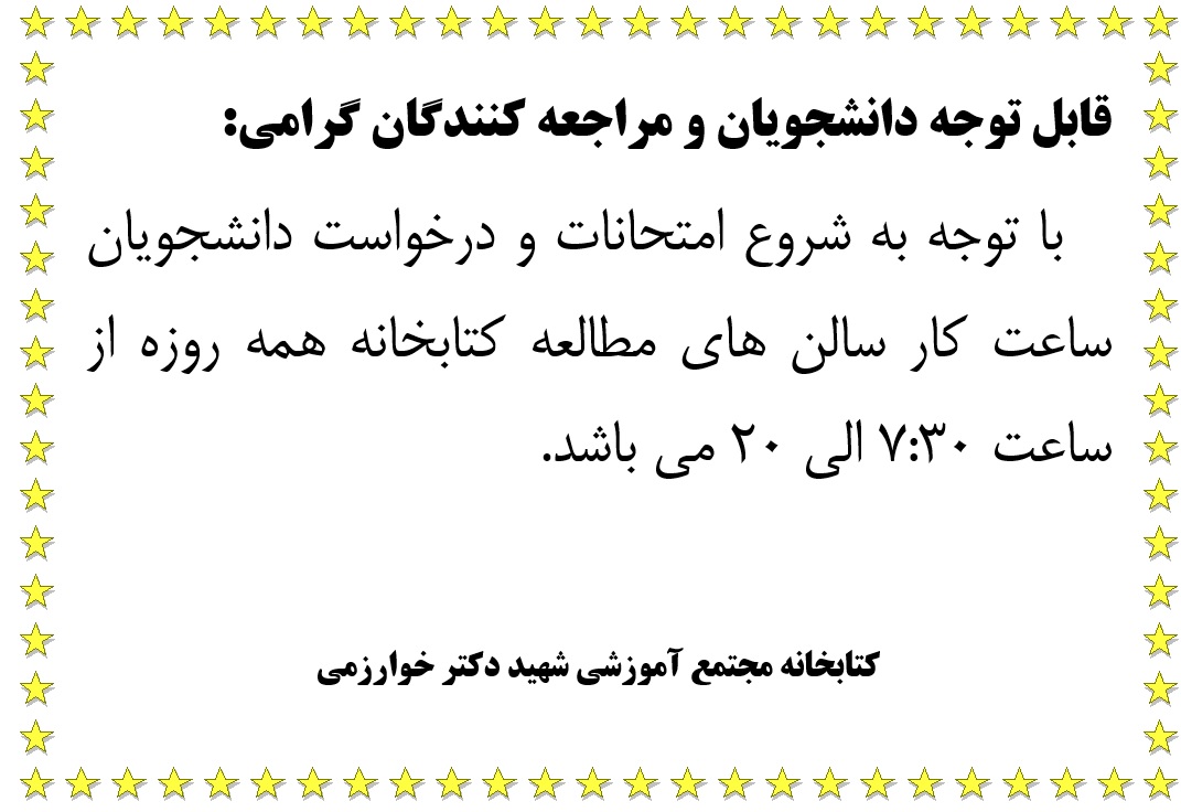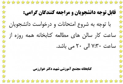 لیست پایان نامه ها مسئول سایت اخبار کتابخانه 04 شهریور 1404 بازدید: 3 امتیاز: ( 0 Rating ) ساعت کاری سالن مطالعه کتابخانه مجتمع آموزش شهید دکتر خوارزمی امتیاز کاربران لطفا رای دهید رای 1 رای 2 رای 3 رای 4 رای 5 قبلی بعدی